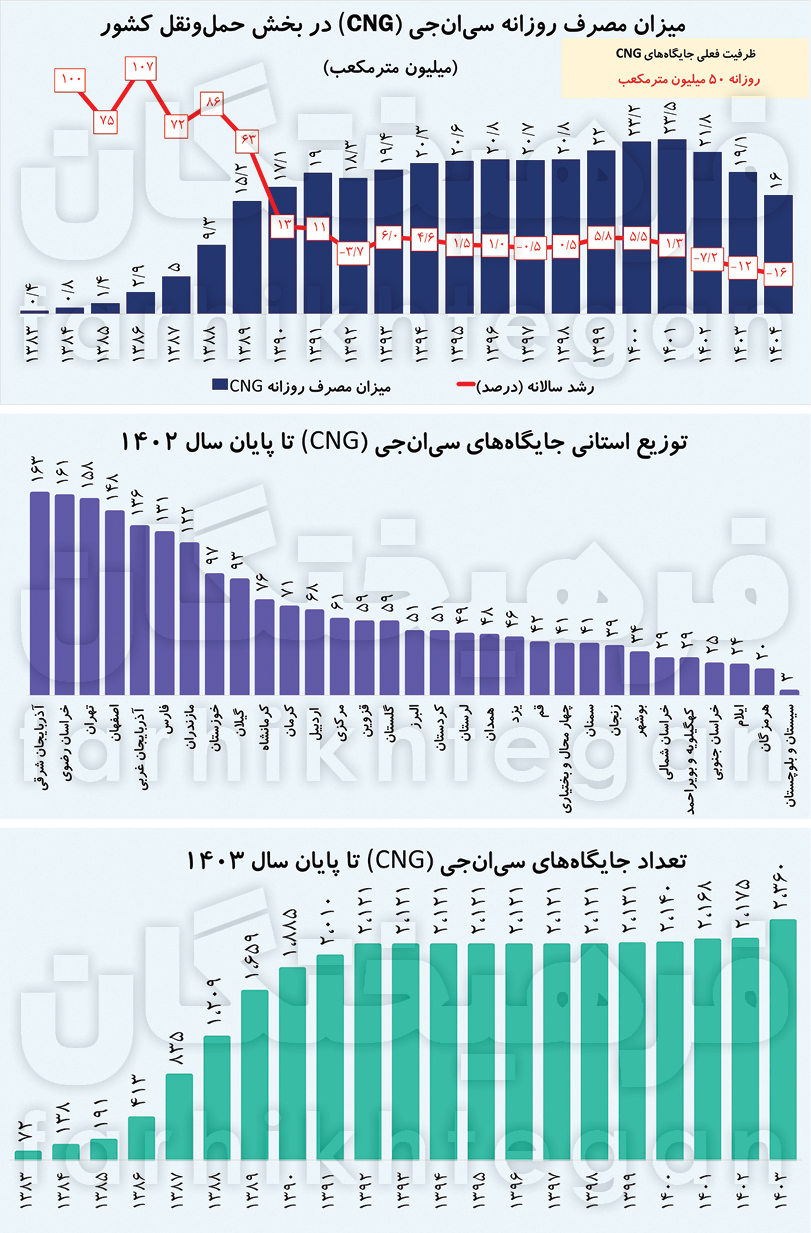 آمار میزان مصرف روزانه CNG در بخش حملونقل کشور نشان میدهد مصرف این سوخت که در اواخر دهه ۸۰ و اوایل دهه ۹۰ در اوج بود سال به سال رو به افول رفته است. اوایل دهه ۸۰ و به طور دقیق تر سال ۸۳، درست در روزهایی که استفاده از CNG تازه داشت به مد جدید مصرف سوخت در حمل و نقل تبدیل میشد، چیزی در حدود ۰.۴ میلیون متر مکعب در هرروز مصرف میشد، این عدد در سال بعد ۱۰۰ درصد افزایش یافت و به ۰.۸ میلیون متر مکعب رسید. روند صعودی مصرف CNG تا جایی ادامه یافت که در سال ۸۹ بیش از ۱۵ میلیون متر مکعب مصرف در هر روز به ثبت میرسید.