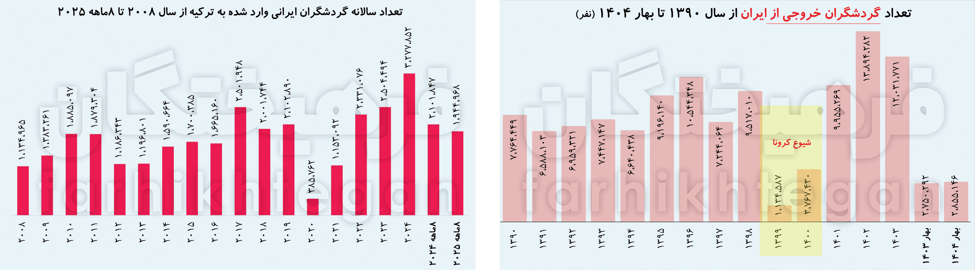 براساس دادههای وزارت گردشگری ترکیه، در ۸ماهه سال ۲۰۲۵ تعداد یک میلیون و ۹۴۵ هزار گردشگر ایرانی وارد ترکیه شدهاند که ۱۵۷ هزار نفر نسبت به مدت مشابه سال گذشته کاهش نشان میدهد. این آمارها بسیار قابل تأمل است. تعداد ایرانیهایی که در ۸ماهه سال ۲۰۲۵ به عنوان گردشگر به ترکیه سفر کردهاند، از کل گردشگران ۱۲ ماهه سالهای ۲۰۰۸ تا ۲۰۲۱ بیشتر بوده است. همچنین رکورد سفر گردشگران ایرانی به ترکیه در ۱۲ ماهه سال گذشته شکسته شده است و نزدیک به ۳.۳ میلیون ایرانی از ترکیه بازدید کردهاند.