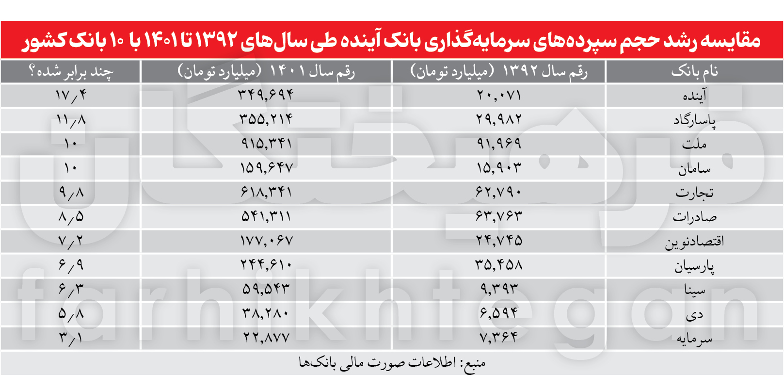 در همین خصوص مرور دادههای صورت مالی بانک آینده از رقم مانده سپردههای بانکی نیز بسیار قابل تامل است. طبق دادههایی که در جدول گزارش حاضر آمده، درحالی حجم سپردههای بانک آینده از حدود ۲۰ همت در سال ۱۳۹۲ با رشد ۱۷.۵ برابری به حدود ۳۵۰ همت در پایان سال ۱۴۰۱ رسیده که این میزان در ۱۰ بانک کشور که اغلب آنها از بانکهای بزرگ خصوصی و شبهدولتی هستند، حدود ۶ تا ۱۰ برابر بوده است. برای مثال، رشد حجم سپردههای بانک پاسارگاد طی سالهای ۱۳۹۲ تا ۱۴۰۱ حدود ۱۱.۸ برابر، بانکهای ملت و سامان ۱۰ برابر، تجارت ۹.۸ برابر، صادرات ۸.۵ برابر، اقتصادنوین ۷.۲ برابر، پارسیان ۶.۹ برابر، سینا ۶.۳ برابر و برای بانکهای ناتراز دی و سرمایه به ترتیب ۵.۸ و ۳.۱ برابر بوده است. با توجه به اینکه صورت مالی بانکهای دولتی قبل از سال ۱۳۹۸ در دسترس نیست، در صورت در دسترس بودن صورتهای مالی این بانکها، بازهم مشخص میشد که بانک آینده رکورددار جذب سپرده در نظام بانکی است.