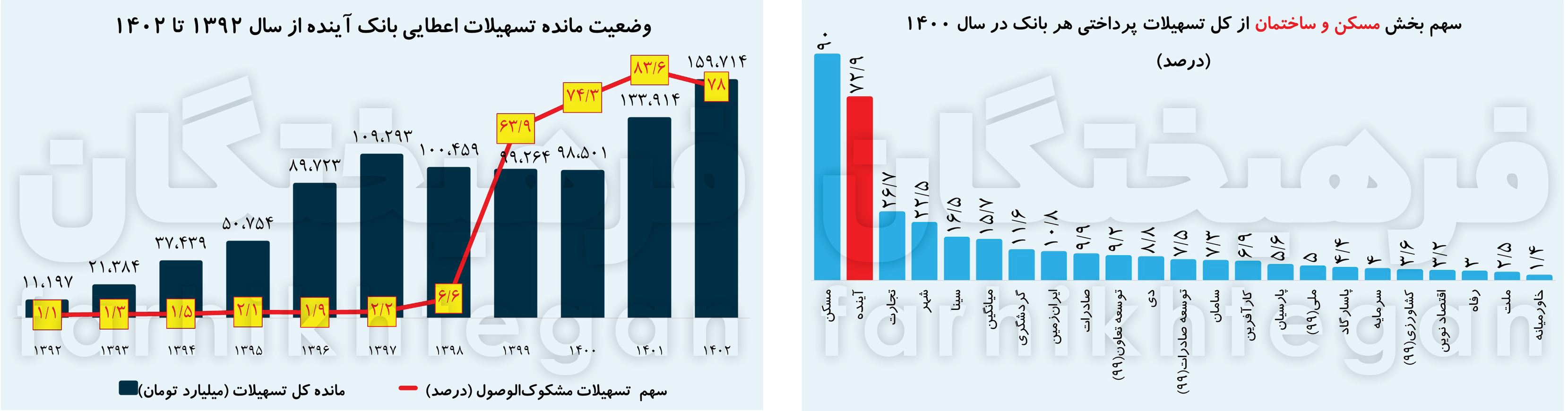 بررسی دادههای بانکی نشان میدهد بانک آینده در تسهیلات غیرجاری نیز اول است، به طوریکه در سال ۱۴۰۲ سهم تسهیلات غیرجاری از کل تسهیلات اعطایی این بانک به ۸۰.۷ درصد رسیده است. این مقدار در دومین بانک ناتراز، یعنی بانک سرمایه ۷۴ درصد، در بانک دولتی صنعت و معدن ۴۷ درصد، در بانک دی ۳۰.۴ درصد، در بانک خصوصی پارسیان ۲۳.۸ درصد و در بانک شهر ۲۱ درصد بوده است. کمترین مقدار نیز مربوط به بانک قرضالحسنه مهر ایران با کمتر از نیم درصد، بانک خصوصی سامان با ۱ درصد، بانک سینا با ۳ درصد و بانکهای پاسارگاد، توسعه تعاون و رسالت نیز ۳ درصد بوده است. طبق دادههای سال ۱۴۰۲ بانک آینده، از حدود ۱۶۰ همت مانده تسهیلات بانک، تنها ۳۱ همت از آن در طبقه جاری قرار داشته، ۲ همت سررسید گذشته، ۲.۲ همت معوق و ۱۲۴ همت مشکوکالوصول بوده است. به عبارتی، از مجموع تسهیلات بانک، حدود ۸۱ همت غیرجاری و بدتر از آن، ۷۸ درصد مشکوکالوصول بوده و تنها ۱۹ درصد جاری بوده است.